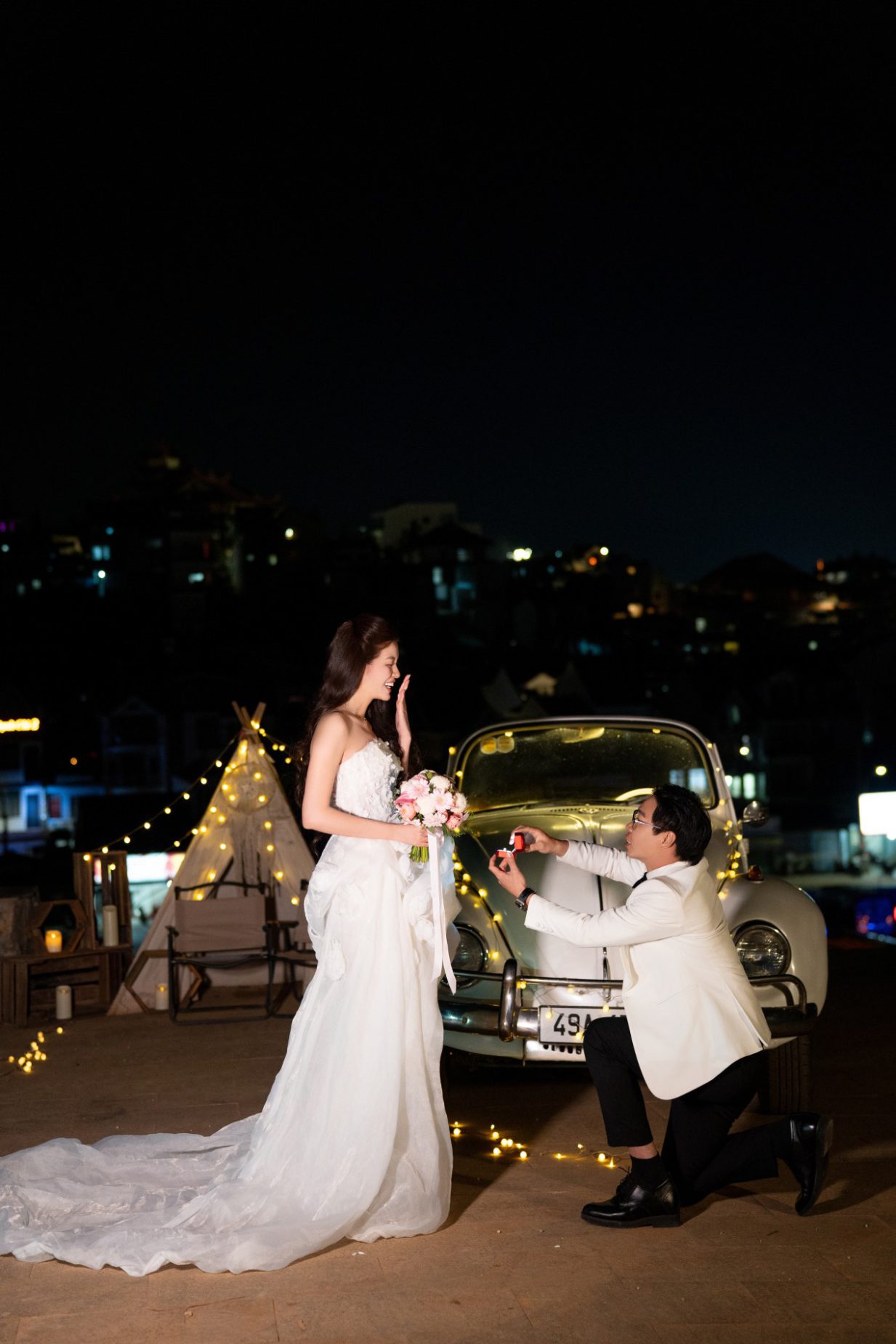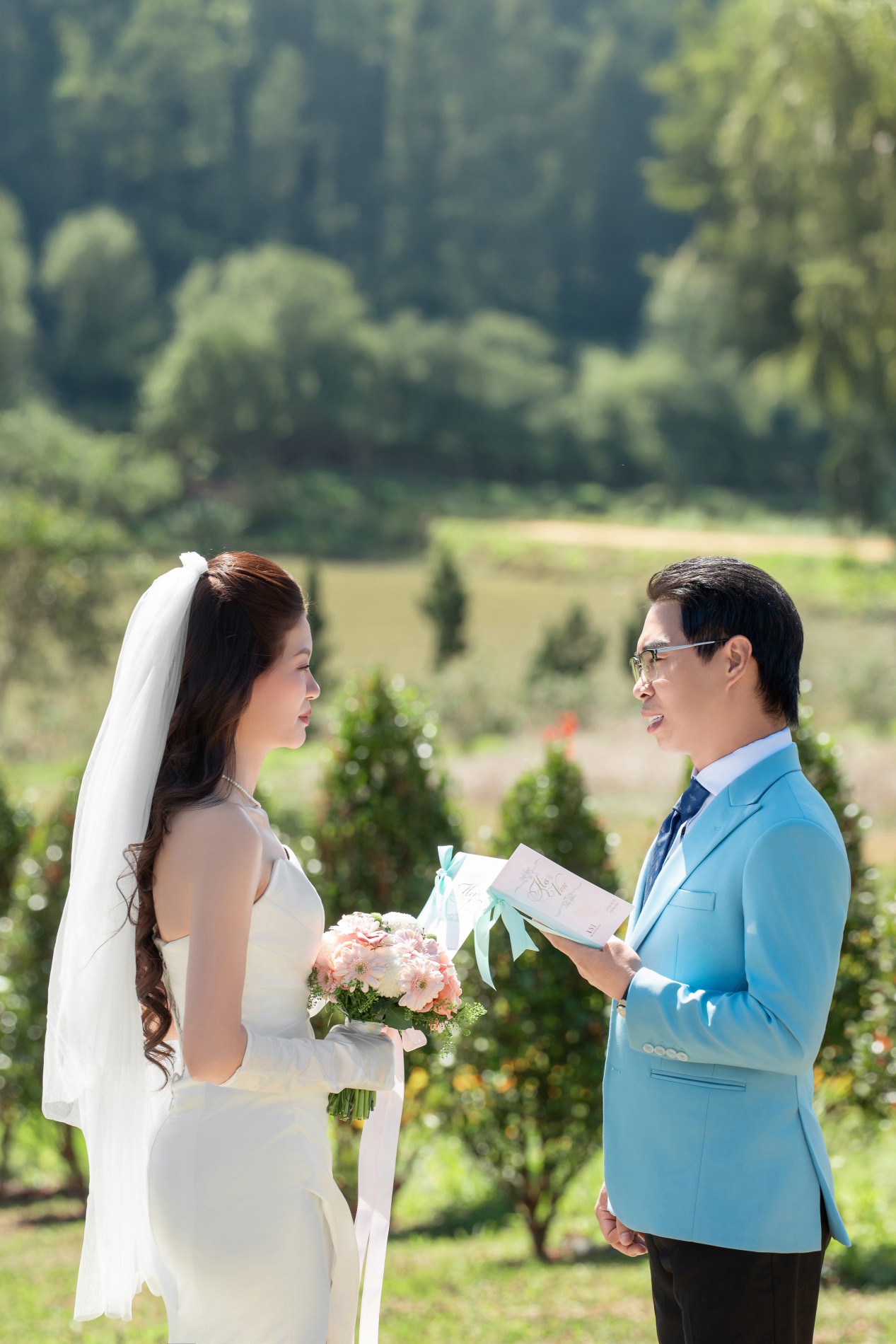 "Cảm ơn Em đã kiên nhẫn cùng Anh đi qua những ngày khó khăn để thấy được cầu vồng ngày hôm nay. Cảm ơn Em vì đã đồng ý trở thành người bạn đời, thành gia đình và thành cả thế giới của Anh. Anh không hứa sẽ mang lại cho Em một cuộc sống hoàn hảo, nhưng Anh hứa sẽ yêu Em theo cách hoàn hảo nhất có thể."